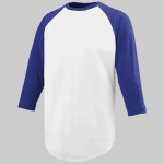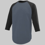 4.8 ounce 50% polyester/50% cotton jersey knit * Crew neck * Contrast color neck and sleeves * Raglan sleeves * Serged fishtail bottom
